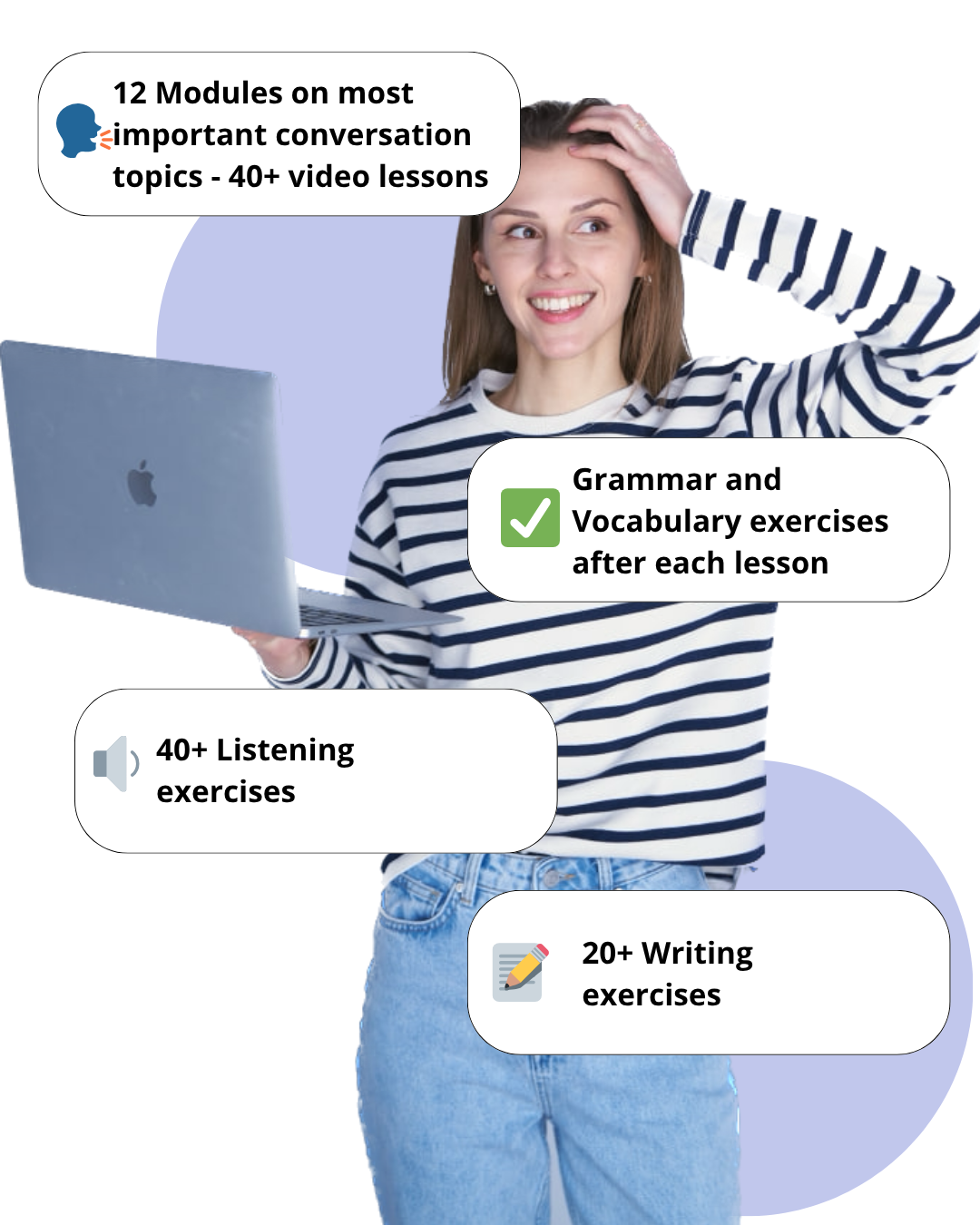 A total of 120+ exercises. This course aims to be as practical and interactive as possible, after every lecture you are provided with exercises on vocabulary, grammar, pronunciation and listening comprehension.